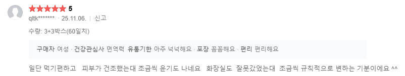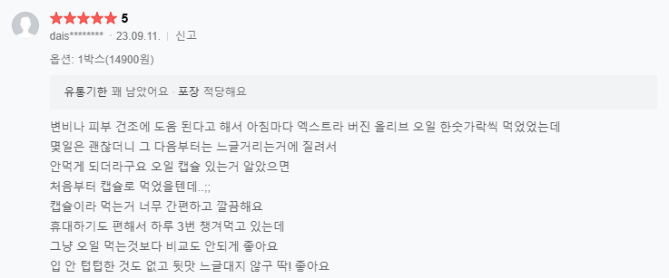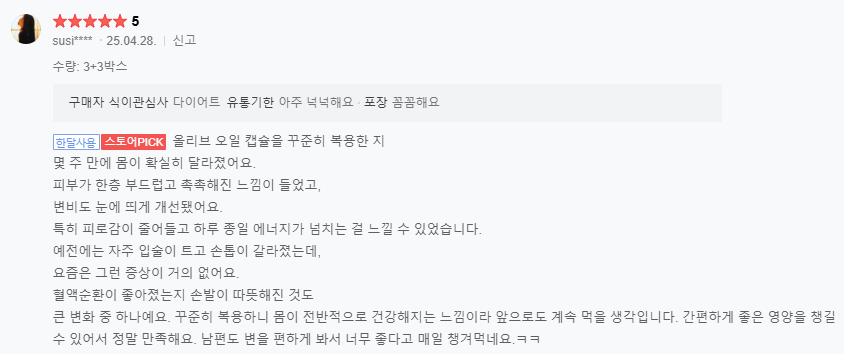 이런 이론적인 이야기들이 실제 생활에서도 체감될 수 있을까 하는 의문이 생기곤 하는데요. 이러한 의문이 해결되는 건 사실 연구 논문보다도 사용자들의 실제 경험이죠. 위의 이미지는 실제 올리브오일을 꾸준히 섭취한 고객들의 후기예요. 후기를 살펴보면 피부와 관련해 공통적으로 등장하는 표현들이 있어요. "피부가 전보다 덜 건조하고 조금씩 윤기도 나네요", "피부가 한층 부드럽고 촉촉해진 느낌이에요" 이러한 후기들이 흥미로운 이유는 대부분 보습제를 추가했다는 이야기가 아니라 먹는 루틴 하나를 바꿨을 뿐이라는 점이에요. 겉에 바르는 관리보다 몸 안의 지방 환경을 바꿨을 때 변화가 나타난 것이라고 볼 수 있죠. 결국 피부가 보내는 신호는 보습제를 바꾸거나 추가해 달라는 게 아니라 피부 장벽을 만드는 재료가 부족하다는 말일지도 몰라요. 겉에 바르는 보습은 마무리의 단계이고, 몸 안에서부터 채우는 보습은 기초 공사에 가깝다고 이해하면 쉬워요. 그럼 이제 바르는 관리에만 의존하던 루틴에서 벗어나 몸 안에서부터 천천히 채워가는 보습 루틴을 시작해 보는 건 어떨까요?